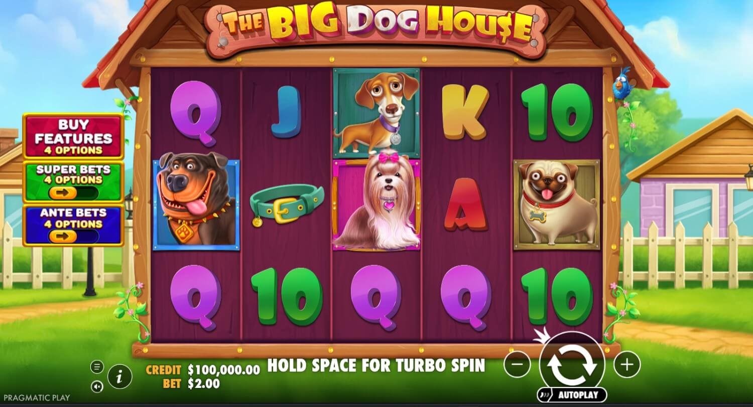 The Big Dog House keeps the canine identity of the series but moves the action into a clean suburban environment with tidy houses, lawns and a brighter overall presentation. The theme is friendlier and more polished than some of the spin-off entries in the wider Dog House line, and the visuals are built to read clearly on mobile: large symbols, strong contrast and obvious feature states.